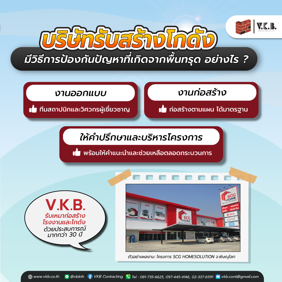 หากคุณกำลังมองหาผู้รับเหมาสร้างโกดัง หรือโรงงานที่ครบวงจรและไว้ใจได้ โดยเฉพาะอย่างยิ่งในพื้นที่ที่มีความเสี่ยงเรื่องดินอ่อนและการทรุดตัว VKB Contracting ของเราคือคำตอบที่ตอบโจทย์ทุกความต้องการของคุณ โดย VKB นั้น มีประสบการณ์ในธุรกิจรับเหมาก่อสร้างโรงงานและโกดังมาอย่างยาวนานมากกว่า 30 ปี ทำให้มีความเข้าใจอย่างลึกซึ้งในการจัดการโครงการขนาดเล็กไปจนถึงขนาดใหญ่
